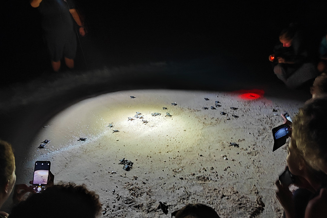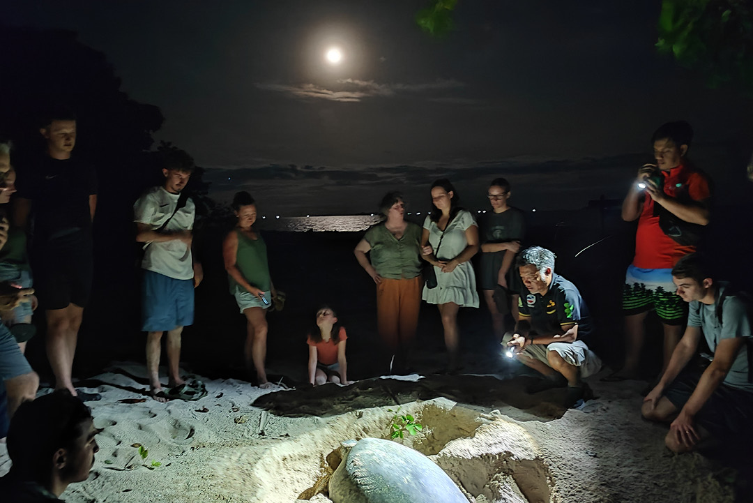 观看海龟岛保育工作的纪录片,并享用自助晚餐。晚餐后,等待工作人员通知是否有海龟上岸产卵,随后在工作人员引领下前往观察海龟产卵、龟卵收集。工作人员会将收集的龟卵转移至孵化场新挖的巢穴进行孵化,并收集之前巢穴刚孵化的小海龟。跟随工作人员来到海边,璀璨星空下,护送小海龟奔向大海。