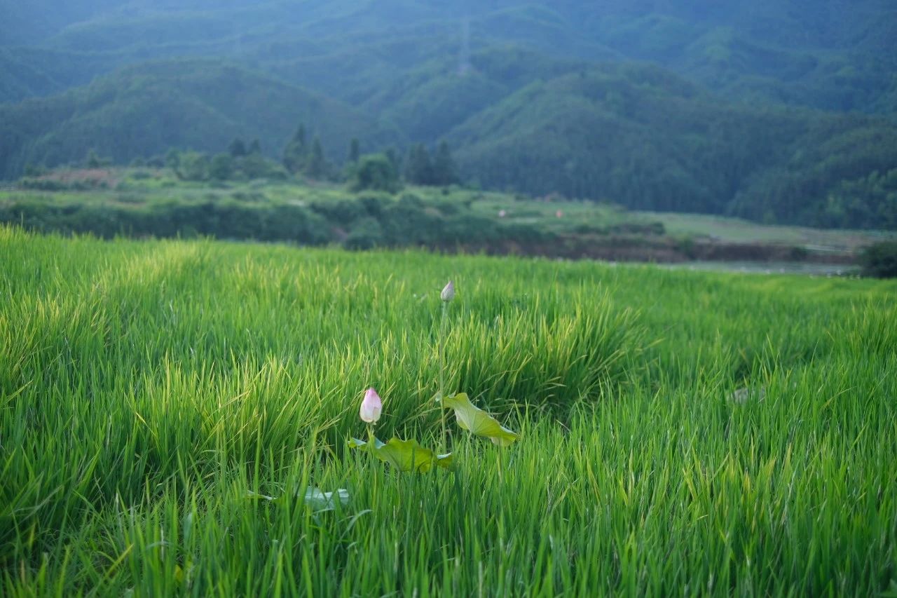 建宁坪上的梯田莲海在面积上也有个世界之最的称号,缓步向上,青稻与碧莲交织在两侧层层叠叠的山梯之上。